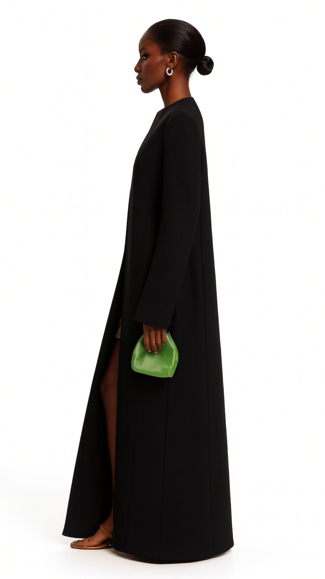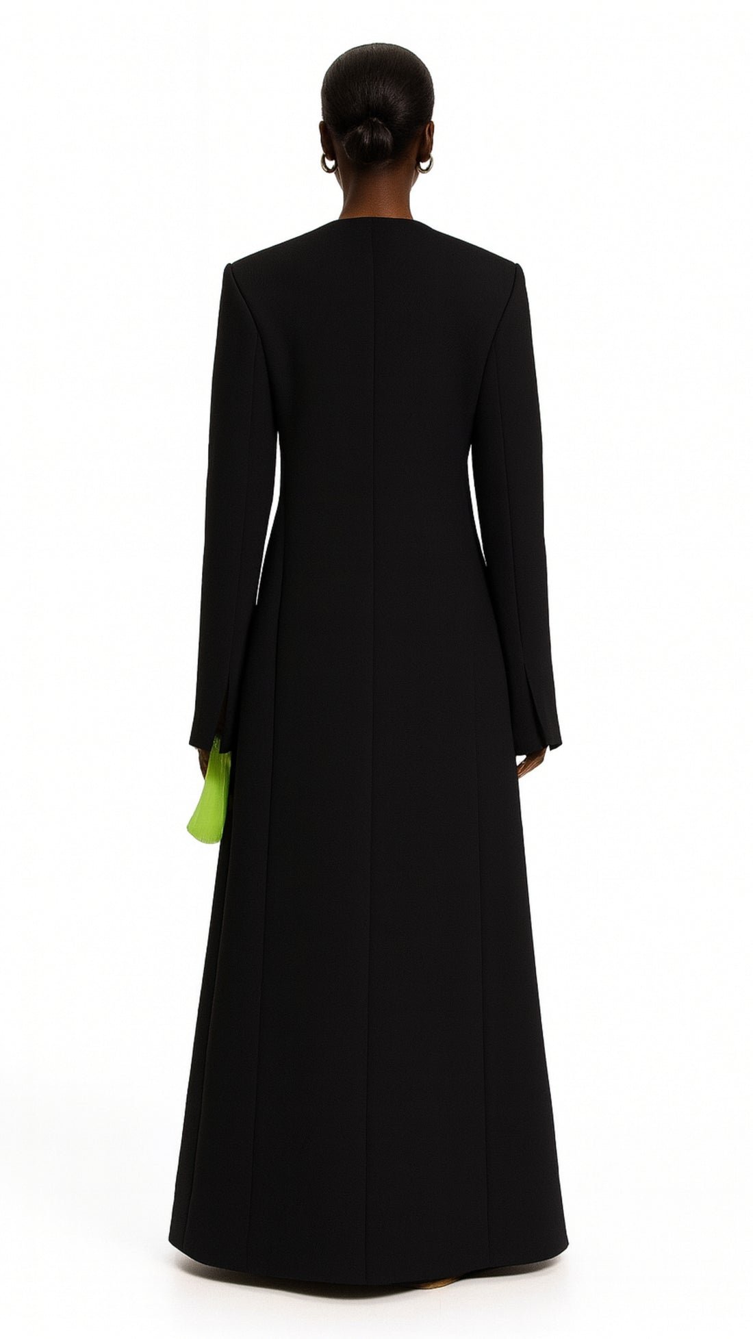 Minimalism redefined — the Noir Sculpt Abaya embodies power and precision through its structured silhouette and architectural lines. Designed with a sleek concealed closure and sharply tailored shoulders, the abaya creates a commanding presence while maintaining fluid elegance. The elongated sleeves with subtle slits add a modern edge, balancing modesty with contemporary flair.